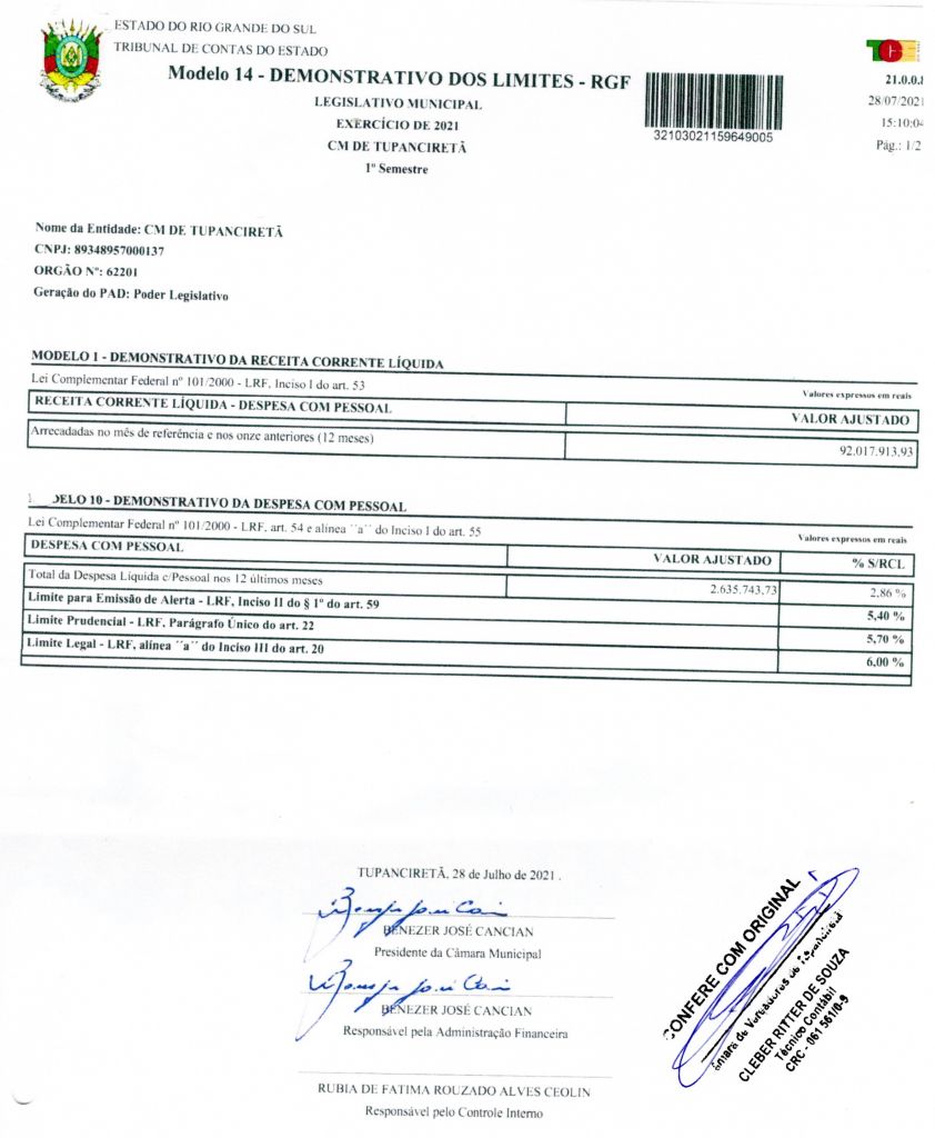 Legislativo publica Demonstrativos de receitas e despesas ano 2021.