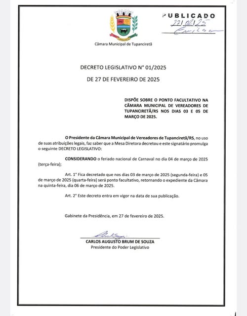 • Decreto Legislativo estabelece ponto facultativo na Câmara nos dias 3 e 5 de março de 2025